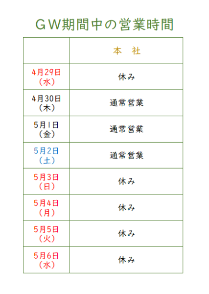 ニュースの詳細 2026.04.24 【 お知らせ 】 ゴールデンウィーク期間中の営業時間 ゴールデンウィーク期間中の営業時間は 下記の通りとなります。 【 本 社 】 4月29日(水)及び 5月3日(日)~5月6日(水)まで休業 ※4月30日(木)~5月2日(土)は通常営業いたします。 お客様にはご不便をお掛けしますが、 何卒ご了承下さいます様お願いいたします。 最新のニュース 5件 【 お知らせ 】 2026.04.24 NEW ゴールデンウィーク期間中の営業時間 【 イベント情報 】 2026.03.17 福島県省エネ家電購入応援キャンペーン実施中!! 【 お知らせ 】 2025.11.27 『ふくしま家づくりの本 2026年版』好評発売中!! 一覧を見る